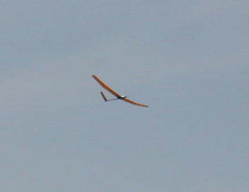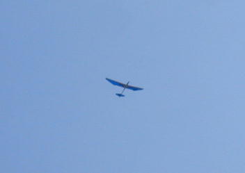 こちらはリブ組クラスの発航です。 強いテンションや巻きっぱなしは厳禁です。 主翼のしなり具合を 見ながら「チョン..チョン..」とウインチのスイッチを操作します。 ある意味、こちらの方が難しいかもしれませんね。 飛んでいる姿は一番美しいB.O.T.です。 |