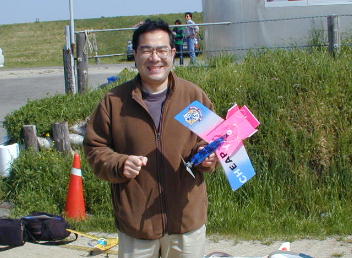 清水さんのCD−ROMブラシレスモーター搭載の機体です。 最低の価格に挑戦とのことで、機体はスチレンボードで制作費は 200円だそうです。 |