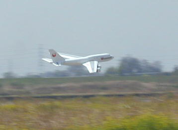 ダクト4発のB747もありました。 ディティールはなかなかでスタイリングも良いですね。 ただ、フライトは .... まるでパイロン機やジェットスケールのようなスピードフライトでした。 ロールやループをやった時はギャラリーからブーイングが出ていました。 これに乗ってたら....ジェットコースターより恐いかも。 こちらはスケールスピードで飛んでいました。 |