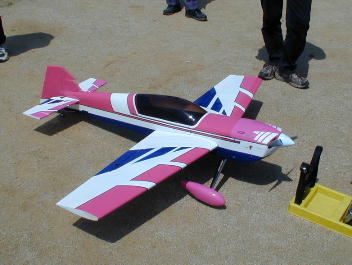 廣瀬さんのクイックです。 この角度では機体の形状が良く判りませんね。 御覧の通りのくし形機です。 難しいとは思うのですが、離陸と同時のロール 等の運動性の良さをアピールしていました。 |