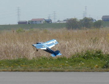 スパン1800ミリオーバーのC−160。 本日初飛行とのことでした。 この画像は2枚ペラですが、フライトでは4葉のペラを装着していました。 パワーいっぱいいっぱいな感じでしたが、スケールライクなフライトでした。 |