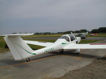 モーターグライダーのグローブG−109Bです。 模型と随分格好が違う 気がします。キャノピーでかい、ノーズ細い... 2機での編隊飛行や高速ローパスを披露してくれました。 エンジン音は結構静かでした。 ランディング時にはスポイラーが翼上面に顔を出します。 見かけ随分と小さ い感じがしますが、ずーんと降下してきます。 |