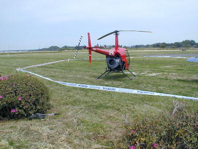 少ないですが、この様に小型ヘリコプターの展示などもありますが、なんと 言っても軽飛行機が数分置きに離着陸する光景が見られる事が素晴らし いです。 一日見ていても飽きる事がありません。 左の植え込みの下に、移動用のタイヤが無造作に置かれています。 |