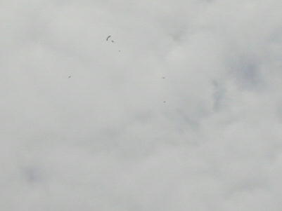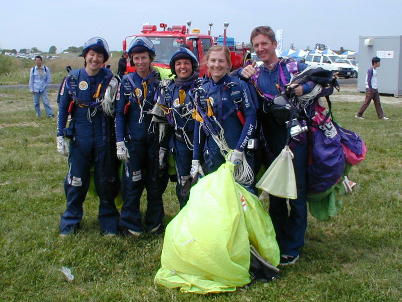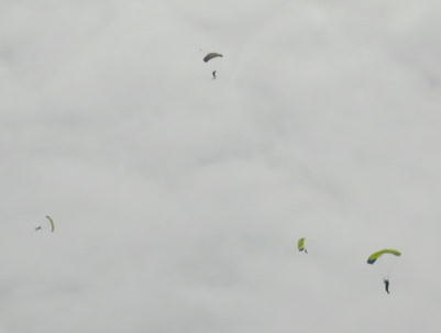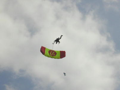 まずはスカイダイビングです。 ダイビング選手権の選手が降りてきます。 画像はフォーメーションダイブでブレークした直後です。 ゴミみたいに見える 4つの点がダイバーで先にパラシュートを開いているのがジャッジだそうです。 その後にパラシュートを開いて「急降下−−急制動」で着地してきます。 風切り音を出しながらの降下にはびびりました。 急旋回から急降下。本来、キャノピーの後ろに付いてくる小さなパラシュート が変な所にありますね。 降りてきたのは海外の女性のチーム。 サービス精神は大変旺盛で、カメラ を向けたら、この様に列んで笑顔を作ってくれます。 |