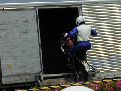 隣接するドライビングスクールからの出張トライアルデモです。 トラックを 使ってトライアルのデモンストレーションを披露してくれました。 解説もおもし ろかったです。 |