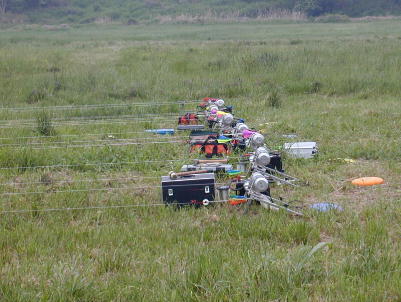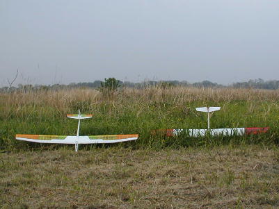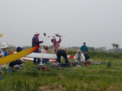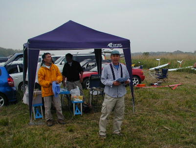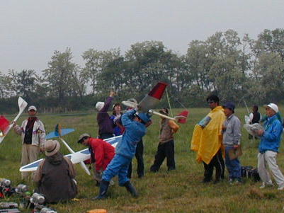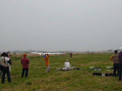 2時を過ぎてエルロンクラスの第2ラウンドが終わる頃には雨も本降りとなっ てしまい、ラダークラスと2Mクラスの第2ラウンドはキャンセルとなりました。 エルロンクラスのみ、フライオフによる決勝を行いました。 F3AやF3Cでは あめが降れば即競技中止だそうですが、このクラスのコンポジット機はメカ回 りのシールがしっかりとしてあれば全天候(ちょっと言い過ぎ)です。 送信機 にカバー(コンビニ袋が大活躍)をすれば問題なしです。 雨を突いて上がっていく機体。 惜しい! 翼端を引っかけてしまっています。 雨天のフライトは思ったほど 飛ばしづらい物ではありません。 上空は曇天と同じように時にはサーマルが 出ています。 ただし、10メートル以下位の地表に近い所はかなり沈んでき て、定点遥か手前で力つきる機体が続出しました。 |