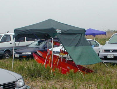 エルロンクラスの第一ラウンド終盤から雨がぽつぽつ降ってきました。 木村はレジャーシート類を総動員して雨を凌ぎました。 タープを張ったりシートを掛けたりと皆さん苦労しています。 極めつけはこれ。 ずらっと並べて雨宿りです。 何故か全機下面が赤い 機体ばかりです。 |