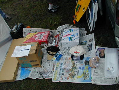 金井会員と真下会員によるタイムラリーゲームのルール説明が行われました。 今回のルールは、2回のトライアルの内の良い点の方とあみだくじによる ボーナス点との合算で順位を決めます。 実際の飛行点もさることながら、ボーナス点が物を言うルールとなっていて、 飛行技術だけでなく、「運」も試されるのが今回のタイムラリーです。 会員から集めた賞品です。 ブラシレスモーターや電池、マイクログラス、キット。 それにビールや「桃」も ありました。 競技の上位者から好きな賞品が選べると言ったシステムです。 参加賞のタマネギ(佐々木会員提供)を分けている競技役員。 このタマネギがとてもおいしい! 去年の飛行会の時のバーベキューの時は、 輪切りにして焼いたタマネギが肉よりも売れ行きが良かった位でした。 我がサーマルファミリーは電動飛行機とグライダーのクラブですので、タイム ラリーも動力付きルールと無動力ルールとがあり、動力付きは3分、無動力は 2分の飛行時間になっています。 クラブでも例に漏れず動力付きはEPP製、 もしくはスチレンボード製のファンフライ機が流行っています。 目の前でクル クルと飛ばすのは時間内に降ろすタイムラリーでは有利なようで、皆さん良い 成績でした。 木村はショックコードで1.7メートルクラスのサーマル機を上げましたが、 ショックコードの整備不良でなかなかスタートさせる事が出来ず、皆さんに迷惑 を掛けてしまいました。 おまけに、コンマ78秒オーバーで第1ラウンドは失格。 それでもRadinaで臨んだ第2ラウンドとボーナス点に助けられて、一等賞を いただいてしまいました。 賞品に選んだのはブラシレスモーターとバッテリー 色々のセットです。 |