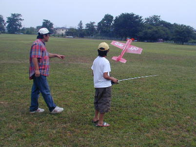 山梨から遊びに来てくれた西野さん親子。 息子さんもファンフライ機を手足のようにクルクルと飛ばします。 反射的にラダ ーの打てる彼、尊敬しちゃいます。 |