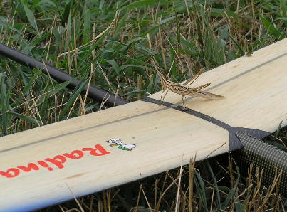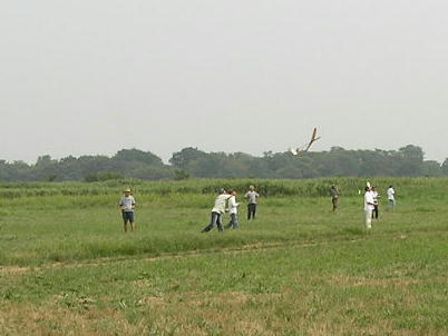 競技再開です。 またしてもサーマルのない渋いコンディションです。 吹き上げの発生する木の近くに機体が集まります。 あまり寄せると....ほ〜ら、木になった。 釣り竿のレスキュー隊が出動して無事回収出来ました。 |