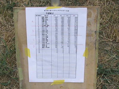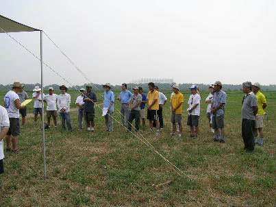 主催であるステッペンボルフの道山さんです。 本日のコンテストディレクターです。 主催の挨拶とフライトエリア、競技ルールの説明を行いました。 競技ルールは今までになかった、予選+敗者復活勝ち上がり 方式の決勝戦とで構成さています。 この方式では、予選下位 の選手でも、敗者復活戦で勝ち上がれば優勝も可能という物で、 凡ミスで下位へ沈んだ人でも優勝のチャンスがあると言う物です。 それと今回初なのが、発航点が設けられている事です。 発航は毎回このポイントを基点として行われます。 離れた所に ランディングしてしまった時は、機体を回収してこのポイントまで 戻ってからランチをしないといけません。 これは、ランチ時の安全 を考えての処置です。 |