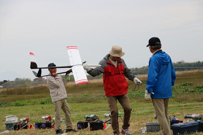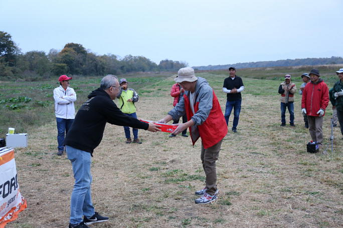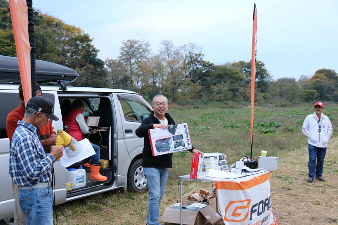 ![]() 競技の成績集計の合間に、お楽しみ抽選会です。 G−Forceさん協賛の景品が沢山並べられています。 ドローンに充電器、リポチェッカーと種類も豊富です。 この頃から、ポツポツと雨が落ち始めました。 競技中に降らなくて良かったです。 ![]() 大型ドローンを引き当てた幸運の持ち主です。 ![]() 木村はマイクロドローンを引き当てました。 部屋で遊べるヤツですね。 |