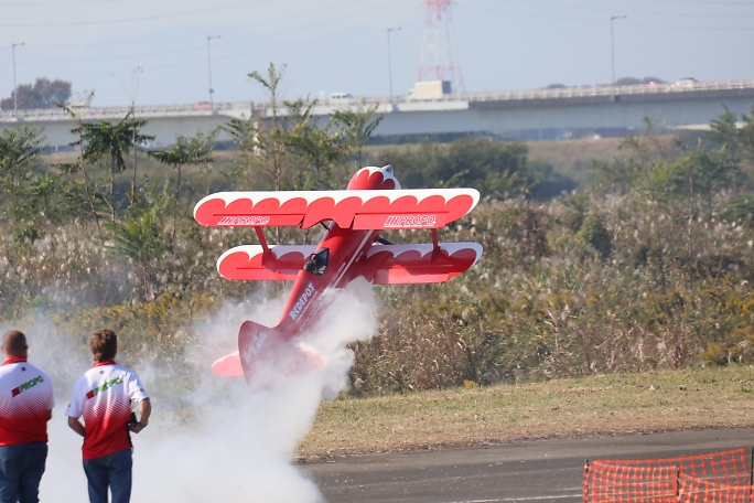 ![]() IMAC機のフライトです。 低い所をグリグリと凄い迫力です。 スモークはもはや必須のようです。 |