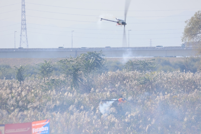 タービン機が1機、ループからの引き起こしで主翼がバンザイ、墜落炎上してしまいました。 消化器を持って速効で 消火作業をしていました。 |
