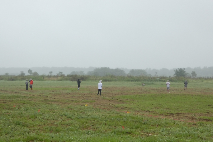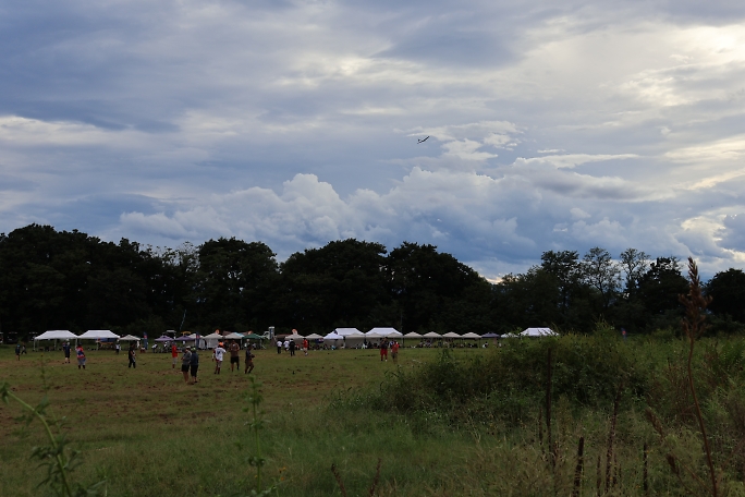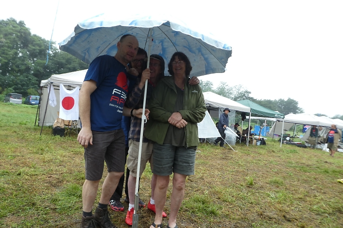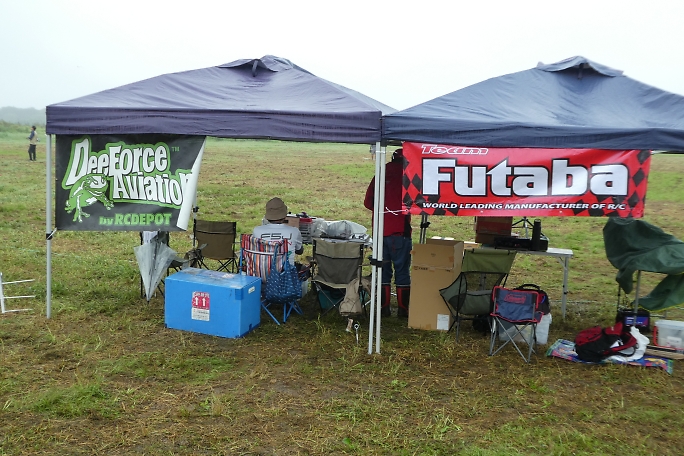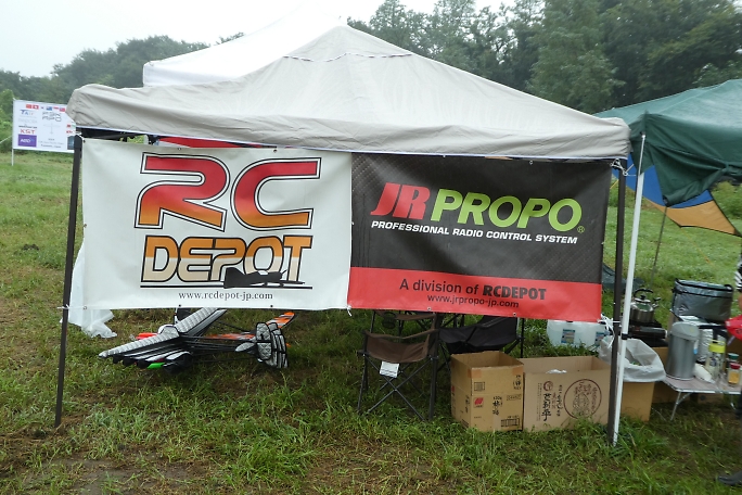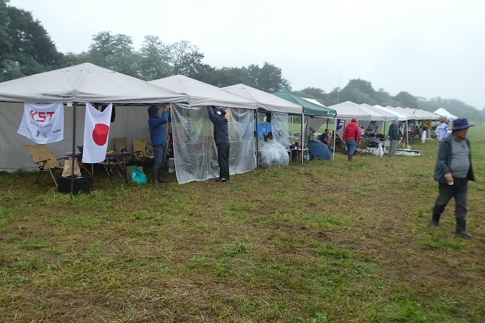 ![]() 小雨の朝。 各テントも雨対策。 それでも飛ばす人達。 ![]() 雨よけを兼ねて本部テントにバナーを設置。 |