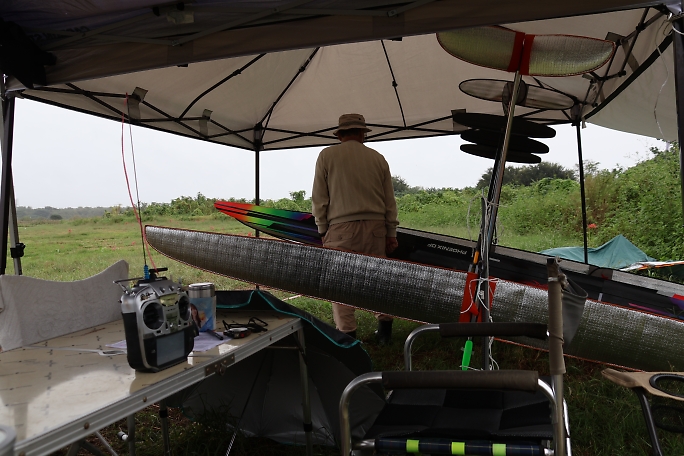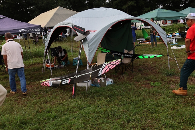 上里チームのピットはテントの一張りを駐機場として使いました。 APOで導入した中骨付きのテントはとても優秀で、特に