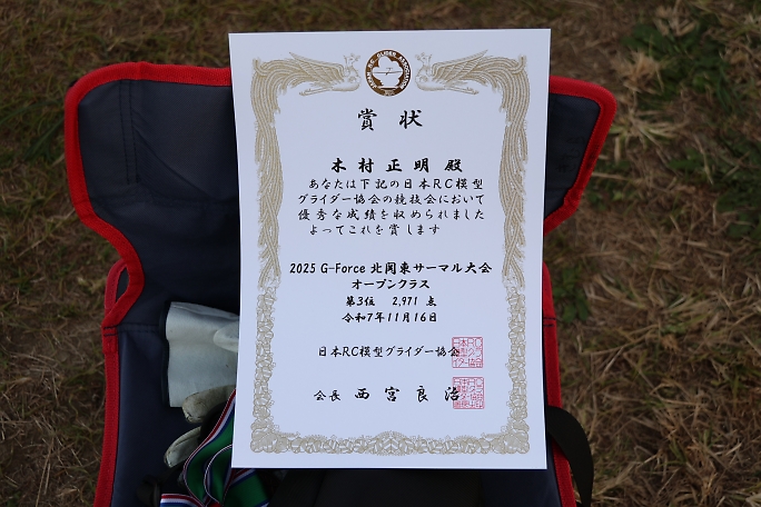 2025.11.16 上里模型グライダー場において 第29回 G−Force北関東サーマル大会が開催されました。 オープンクラス、リブ組クラス、2Mクラスの3クラスで競技が行われました。 前日のF3L関東大会が開催されましたが、前日の好天に負けない絶好のサーマル大会日よりとなりました。 朝方の気温は10℃以下で、最高でも17℃止まりでしたが、穏やかな風で、日向では汗ばむ程です。 サーマルも 良く出ていて、各クラス僅差の成績でした。 |