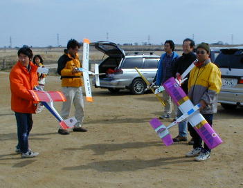 お昼過ぎ、フライトをあきらめて記念撮影....と機体を持ち出しました。 木村の機体はどれも軽量機で、持ち出すことが出来ませんでした。 スキー渋滞の高速に阻まれながらも遠方かいらした皆さん、お疲れさまでした。 |