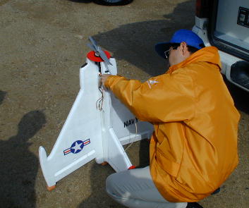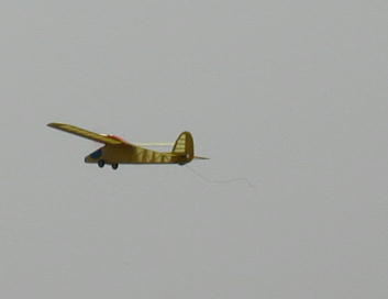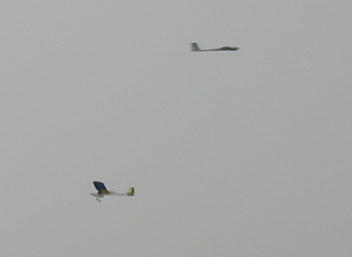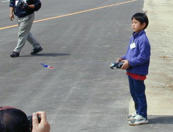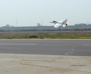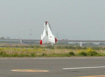 牛島さんのF16です。 車輪の装備されていないダクト機はショックコードにより初期加速を行います。 写真はコードから離脱した瞬間です。 この後この機体はもの凄いスピード フライトを披露してくれました。 |