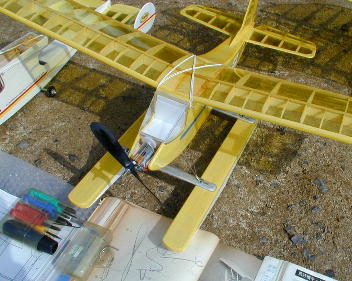 上戸さんのミニプレーンたちです。 この機体はユニオンのモーターに自作ギヤユニットで軽快に飛行します。 フロートを履いていますね。 離陸こそは手投げでしたが、着陸は昨日の雨 で出来た水たまりに着水です。 |