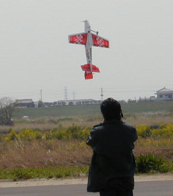 スペシャルゲスト? 雑等でおなじみ「トルクローラー小野」さんのトルクロールです。 しかも機体は今日初めて飛ばす機体。 さすがです。 この他にも何機も「小野マジック」でくるくると回していました。 初めての機体でも推力チェックだけで行けちゃうんです。 |