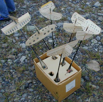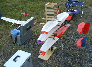 オープンクラス大薗さんのランチです。 左翼が..... この直後左翼が粉砕、残念な事になってしまいました。 大薗さんのピットではこの様なラックに自作機が並んでいます。 こんなのもありました。 もはやコメント...出来ず... こちらは小松さん。 ファイヤーワークス改のランチです。 主翼と水平尾翼の捻れに注目! 際を狙いすぎて木になってしまいました。 すぐさま救助隊が出動。無事回収する事ができました。 SFCのスタッフが出してきた先端にフックの付いた釣り竿が大活躍でした。 流郷さんの自作機のランチです。 加納さんをびびらせています。 流郷さんの機体は加納さん工法(主翼前部がバルサムク)で作られています。 所々に入れられたトラスが不思議な雰囲気をかもし出しています。 垂直尾翼は6ミリのソフトバルサを削りだして4ミリ厚としています。 バルサの軽い部分だけを使った贅沢な作りです。 加納さんが持ち込んだHighlight DLG 木村目には一番高く上がっていたように感じました。 |
