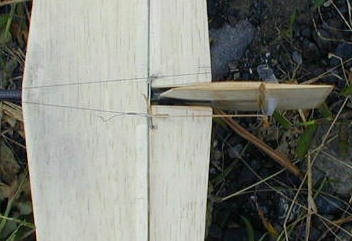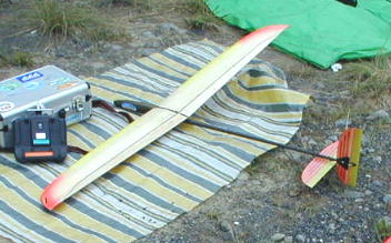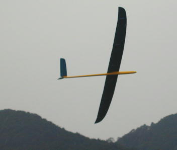 通常ランチクラスのフライト風景です。 HL−1 EVO2? とスペクターの2ショットです。 この2機はまるっきりと言っていいほどデザインコンセプトが異なる機体です。 曇天の中、サーマルを求めて木の近くまでも迫りまる横塚さんの自作機。 あんまり近づくと木になっちゃいますよ。 横塚さんの機体の翼端はこの様にハデにカールアップしています。 ペットボトルのRを利用して縦目のバルサを曲げてあるそうです。 |