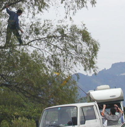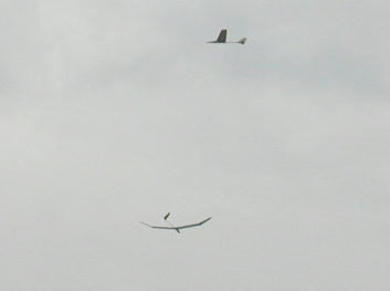 大会の後、エキジビションでF3Jのフライトがありました。 機体は3メートルを超える大きな物で、ぱっと見にはF3B機に似ていますが、 F3B機より大きめに設定された上反角が「滞空マシン」を物語ります。 この様に2人力で引き上げます。 木村はもっと「だだー」って走っていくのかと思いましたが、そう走れるほど 軽い物では無いようです。 ラインのテンションを受けて、ぐぐーっと引っ張ります。 20メートルほどの牽引で150メートル(木村目測)以上上がっている様に見えました。 低空まで下りてくるとさすがに大きいですね。 |