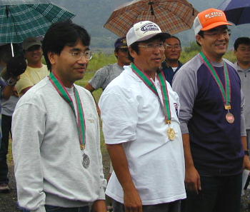 パイロンレースの表彰です。 1位 岡本さん DL−X 2位 堰合さん アトランティス 3位 馬場さん スプリント2 通常ランチクラスの表彰です。 1位 岡本さん スプリント2 2位 大薗(和)さん 自作軽量機 3位 吉田さん スプリント2 オープンクラスの表彰です。 1位 岡本さん DL−X 2位 吉田さん DL 3位 中嶋さん ファイヤーワークス2 でした。 皆さん、おめでとうございました。 それにしても、さすがと言うべきは岡本さんです。フライトは大変参考になりました。 一つずつ増えていく金メダルが全てを物語っていますね。 |