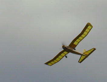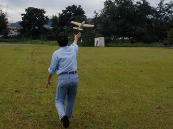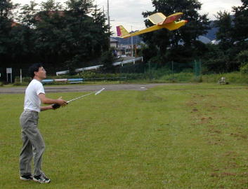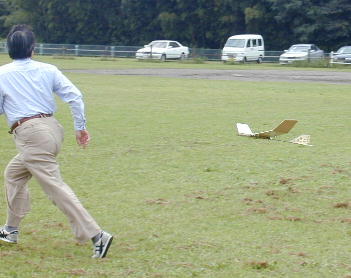 深沢さんのサーマルファミリーオリジナルHLG「ドリーム」に小型モーターを2コ取り付け モーターグライダー化の実験飛行です。 自作のスピコンも搭載していましたが、どうも 推力不足のようで... ペラ保護のためにハンドキャッチに向かいます。 |