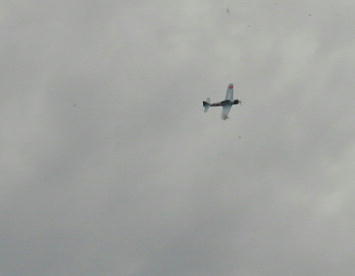 佐々木さんの電動モスキート.モスの発進です。 低空、低速飛行が得意の機体ですが、今日も目線フライトを見せてくれていました。 でも、佐々木さん、本業はかっ飛びスロープやさんなんです。 |