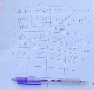 一通り自由フライトを楽しんだ後、タイムラリーをしました。 1R目は2分のタイムラリー、2Rは1R+2Rで丁度3分になるように飛ばします。 かなり燃えました。 手書きですが、本日のレースの結果です。 一番右端の+とか−の数字が3分から出た秒数です。 結構接戦になりました。 上から3段目、木村はなんと+−0のぴったり賞でした。 |