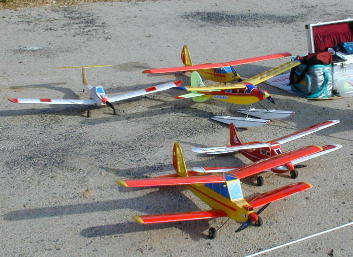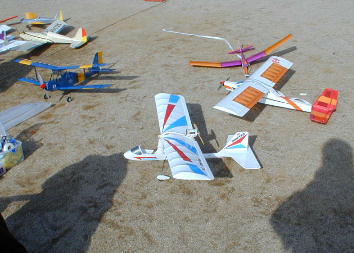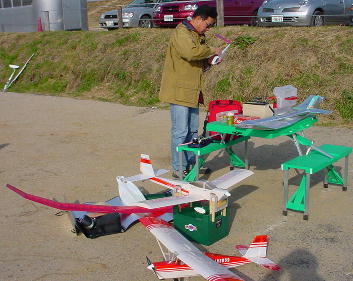 初参加、森崎さんのピットです。 可愛い機体が多いですね。 水上機のスチレンボード尾翼、考えましたねー。 カメラ搭載機が場外.... 「見つかったよー」 |