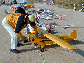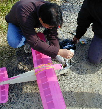 今回何機か来ていたディーゼルエンジン搭載機のエンジン調整風景です。 機体は鳥居さんのリトルサンダー号です。 エーテルを燃料に使っているために、これまた独特な臭いがします。 |
