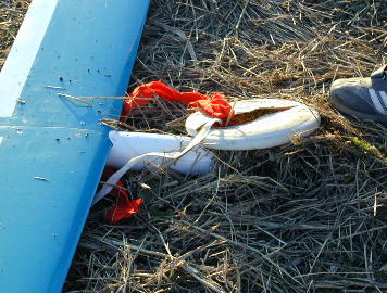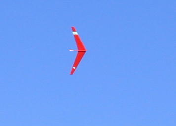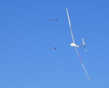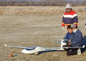 オープンクラスから競技開始です。 このクラスはウインチの性能をフルに利用して発航します。 全体重をかけて機体をホールド、 極太テグスのテンションが最大に掛かった所で機体をリリースします。 これは満点の定点着陸です。 本来は定点に置かれたフリスビーから何メートル離れたかを測定 するのですが、ぴったりに「刺さって」います。 |