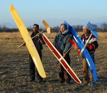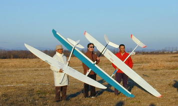 こちらは2メータークラスです。 このクラスはF3B機をそのまま小型にした様な機体からリブ組みや HLGサイズの機体まで様々です。 一人異色を放っていたのはご存じ「信太さん」。 今回は「バンジーグライダー」です。 機体の先端に近い所に付けられたフックに、強力なゴムを掛けて射出 します。 モスキートクラスのHLGサイズの機体にゴムのテンション、 6Kgを掛けています。 リリースすると、目にも止まらぬスピードで射出され、かなりの高度を 取る事ができます。 |