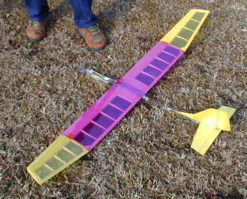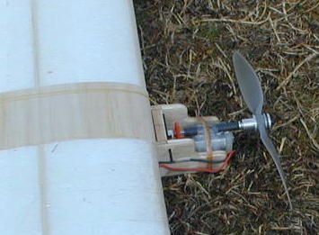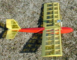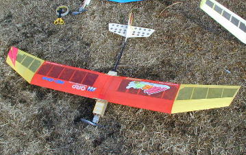 佐々木会長の機体です。 この機体のようなスティックタイプの機体がほとんどでした。 重量も250グラム前後に収まっています。 佐々木さんの場合、より大きなペラを回すべくギヤダウンになっています。 思うようにフライトタイムが伸びず、最後の手段と10インチサイズのペラを 装着。 挽回を狙います。 |