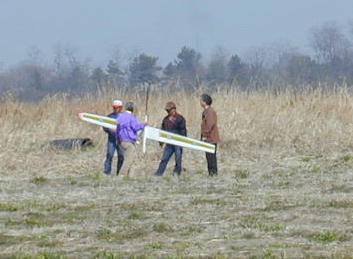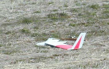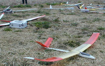 今回、行われた無尾翼クラスの参加機です。 小さい物から大きい物まで5機の参加がありました。 ちょーっと角度が大きいか? 機体のホールドが難しい無尾翼機、発航が難しそうです。 案の定、リリース後にくるくるっと回って.... 残念な事になってしまいました。 |