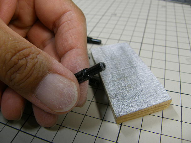 ![]() 今回もキット付属の金属クレビスではなく、樹脂製のクレビスを使います。 このクレビス、色々とバリが出ている ので、綺麗にしてから使います。 特に、縁の部分は傘状に広がっているため、そのまま使うと、後縁スパーとかに引っかかったりしますので、 綺麗に整形しておきます。 削って白くなった所はバーナーで軽く炙ると黒く戻ります。 ![]() ![]() M2のロッドアジャスターを使いますので、穴を1.5ミリのドリルでさらって、M2のタップでネジを切っておき ます。 この後の調整がとても楽になります。 ![]() クレビスのピンですが、ギャップシールに引っかかる分を削り落としました。 |