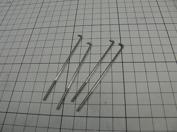 ![]() リンケージロッドを作ります。 リューターのボール盤アタッチメントを使って、Eリング溝を加工します。 今まで は、ニッパーの刃でロッドをグルグルと回して作っていましたが、加減一つで出来が決まるのと、バリが出で しまうので、今回の方法を採用してみました。 使うEリングは1.5と呼ぶ物です。 1.9ミリのピアノ線なので、0.2ミリ切り込んでピアノ線を一周回せば、 1.5ミリの溝が出来る...と言う寸法です。 ボール盤アタッチメントの止まり調整ネジがM3なので、刃が触った所から1/3回転ほど締め込めば、約 0.2ミリの切れ込みになります。 ![]() 加工が終わったロッドです。 0.5ミリ幅で1.5ミリの溝が出来ています。 ![]() 溝から2ミリの所で万力に咥えさせて、キッチリと曲げればリンケージロッドの完成です。 ![]() 不要部分を切り落としたリンケージロッド、一機分です。 |