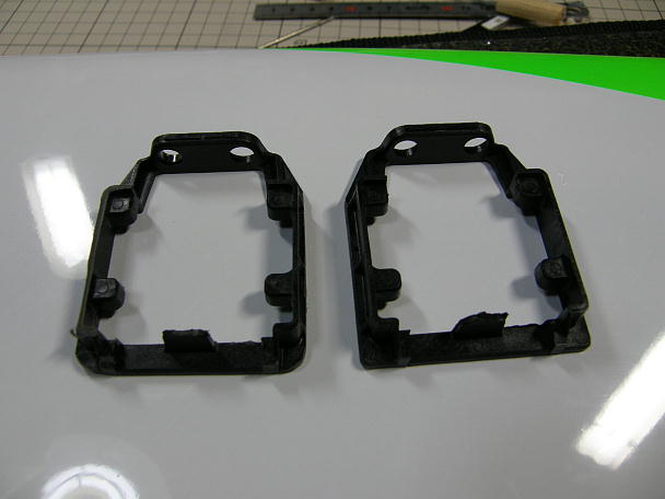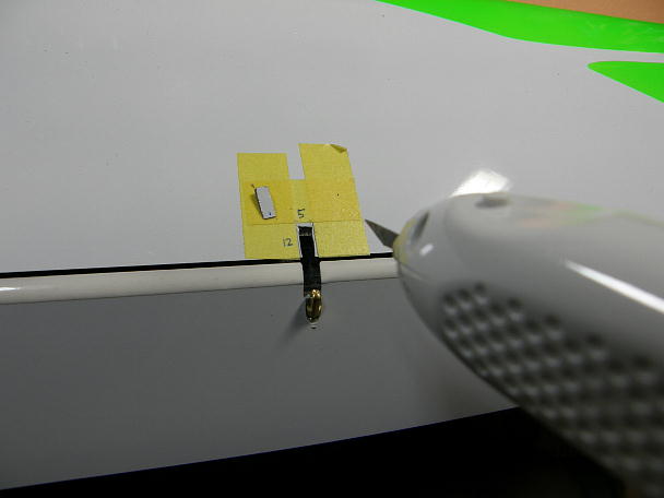 ![]() ホーン穴周辺を可動範囲で樹脂クレビスが当たらないように整形します。 ![]() リンケージの取り出し口を加工します。 これも、今までの経験から、幅5ミリ、長さ12ミリで加工します。 超音波カッターで切り取ってから、リューターで整形します。 ![]() 加工が終わった取り出し口です。 |