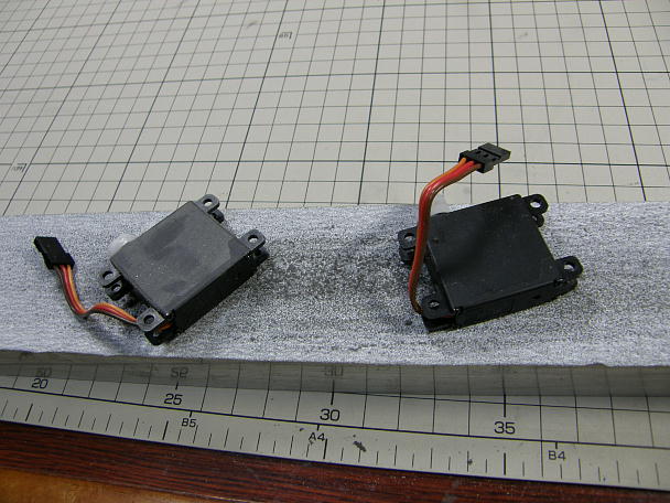 ![]() エルロン側もサーボロックを使用します。 フラップ側同様、角を落としてサーボホールに入るようにしておきます。 ![]() ![]() サーボホーンは一番短い穴を使用します。 穴を1.8ミリに広げておきます。 ![]() サーボにニュートラルを合わせて取り付けておきます。 ![]() サーボの底面になる所をフラップサーボの例がありますので、予め削っておきます。 |