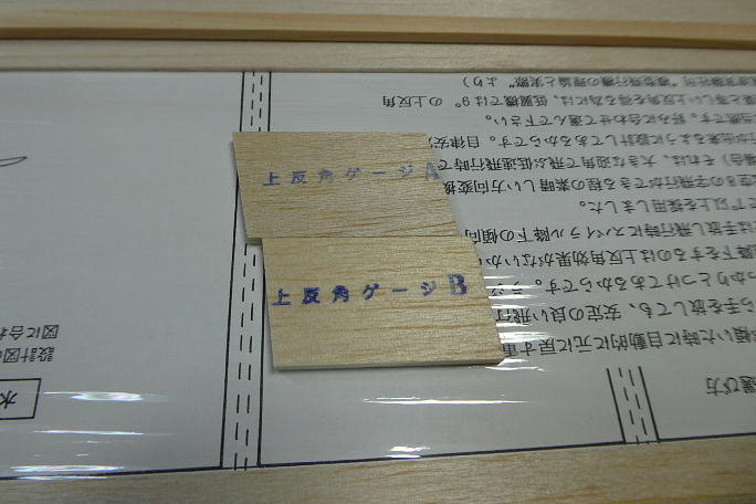 ![]() 先ずは、前縁側、後縁側の下面プランク材に前縁材、後縁材を接着します。 下面プランク材は上面と下面でサイズが 違うので間違えないようにします。 ![]() 今回は、エルロンサーボを主翼内装にしますので、サーボコードの通る穴を事前に開けておきます。 ![]() 上反角を決めるのに使う上反角ゲージが二種類入っています。 上反角ゲージAを使うと上反角10°、Bを使うと上反角が 7°に設定できます。 ![]() 中央リブを上反角ゲージBを使って傾けて接着します。 接着するのは、下面プランク材と前縁材、後縁材のみで、スパーは 接着しないでおきます。 ![]() 各リブを角度に注意しながら接着していきます。 こちらもスパーには接着しません。 ![]() リブの接着が終わったら、上面スパーをそっと置いてみて、リブからの飛び出しなどを確認します。 バルサ製スパーなら、 飛び出したスパーを削ってしまえばいいのですが、ヒノキは大変ですので、リブの溝で調整します。 定盤からの浮き上がりが無い事を確認しつつ、上下のスパーを接着していきます。 これで捻れ取りも出来ているはずです。 ![]() ![]() 前縁材とリブ、後縁材とリブの接合部はこのように段差になっていて、キットのままですと、この部分に三角の隙間が開くことに なります。 工作の簡易化の為の措置でしょう。 |