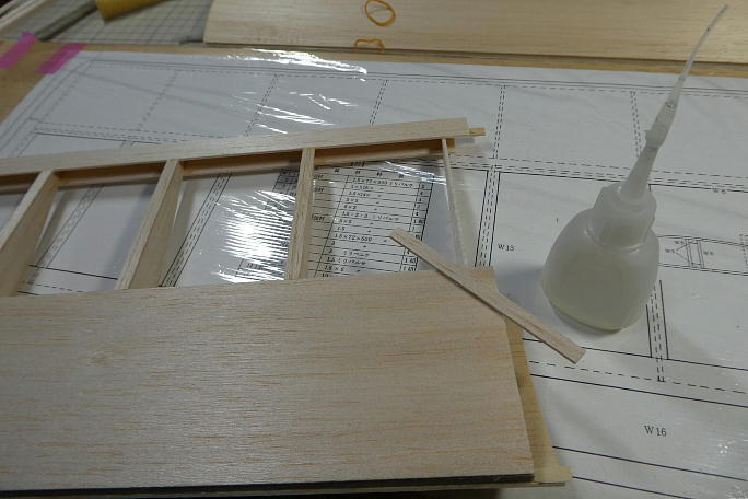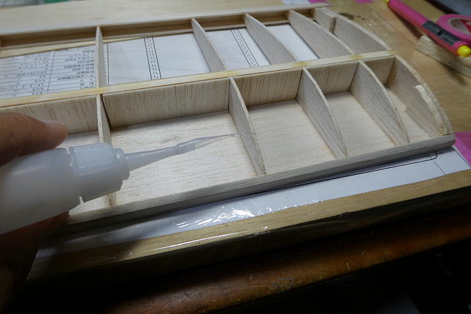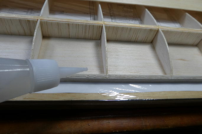 ![]() 上面プランク前に、リブとスパーの段差を綺麗に整えておきます。 今回のキットではスパーはヒノキですので、削れるのは もっぱら出っ張ったリブと接着剤になります。 ![]() リブの切断面に低粘度瞬間接着剤を染みこませて硬化させます。 この後プランク材接着に使う高粘度瞬間接着剤が 染み込んで目減りするのを防ぐ為です。 ![]() 高粘度瞬間接着剤をリブ、スパー、前縁材に盛るように塗布します。 染み込み防止処理もしてありますので、瞬間接着剤 といえども簡単には硬化しませんので慌てずに作業します。 ![]() 接着面を硬化促進剤を染みこませたウエスで拭いた上面プランク材を、位置を決めて降ろし、両手を広げた状態で しばし、押さえておきます。 30秒もすれば、手を離しても大丈夫です。 ![]() ストレス発散、捻れ取りの為に、軽く重しほ掛けて、一晩寝かせます。 |