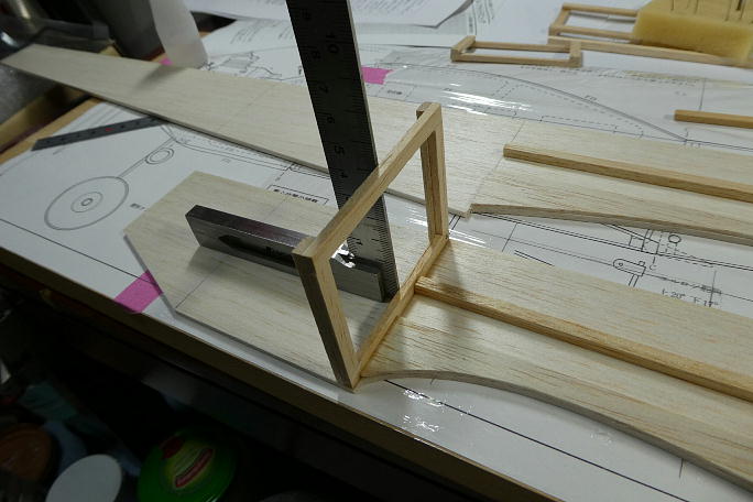 ![]() 胴体に胴枠を接着する位置をマーキングします。 図面には胴枠取り付け位置の引出線が書かれているので、これを 利用して鉛筆でケガキます。 ![]() 胴体側板を背中合わせにして、胴枠位置を書き移します。 個々に書き込むと、右側を2枚作ってしまう危険性もあり ますが、この手法ですと、その心配はありません。 ![]() 主翼取り付け部の補強を接着をします。 同時に、サーボマウントを取り付けるサーボレールを3ミリスクラップバルサ から切り出し、接着しておきます。 ぱっと見、同じ物を2枚作ってしまったように見えますが、上は右方向が前、下が左方向が前になります。 ![]() 主翼前後の胴枠は同じサイズなので、側板に対して直角に立てて接着します。 ![]() モーターマウントわ接着します。 この段階でサイドスラストとダウンスラストを付けています。 スバル09号は設計では ダウンスラストは0°ですが、1°だけ入れておきます。 ![]() 全ての胴枠が接着されました。 |