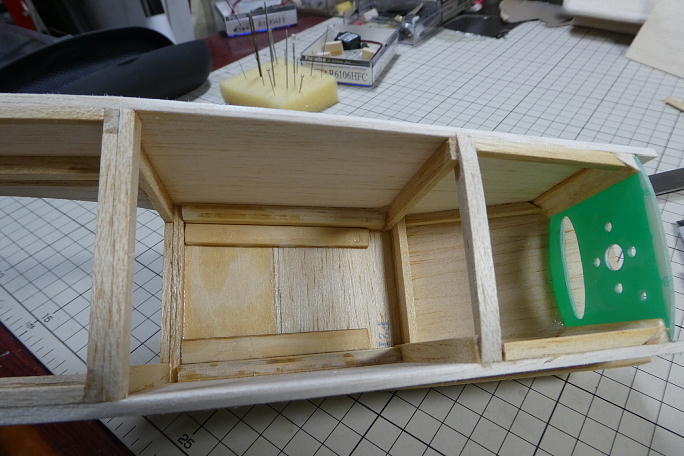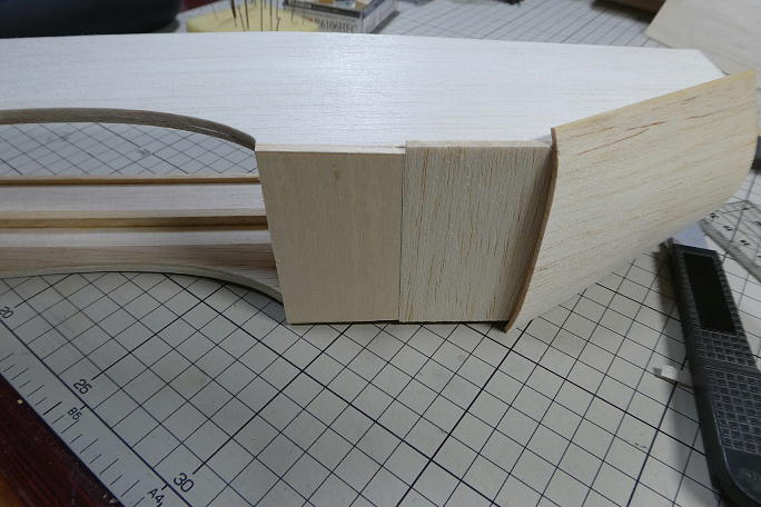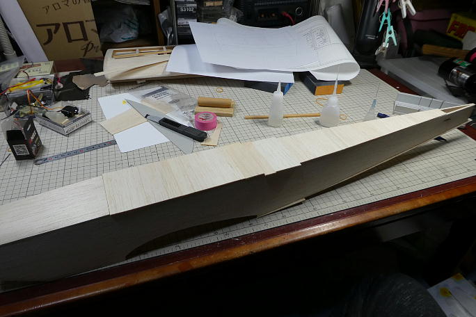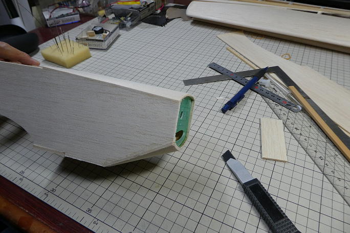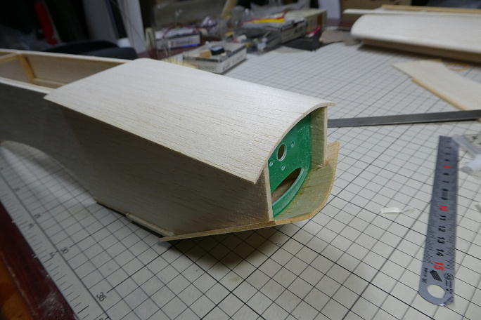 ![]() メインギヤ取り付け部は3ミリベニヤでプランク、内部に更に3ミリベニヤの補強を入れて、井桁構造にします。 この部分は負荷の掛かる面積広げて、負荷分散を図ります。 ![]() メインギヤ取り付け部分に繋がるプランクは3ミリバルサで、機首部分は2ミリバルサでプランクします。 曲げに少し 無理がありますが、力業で。 ![]() 上面も2ミリバルサでプランクします。 ![]() はみ出た部分のみ切り取りサンディングしておきます。 後で、全体を見ながら整形します。 ![]() 底部もはみ出た部分のみのサンディングです。 |