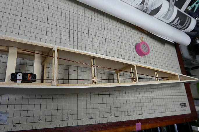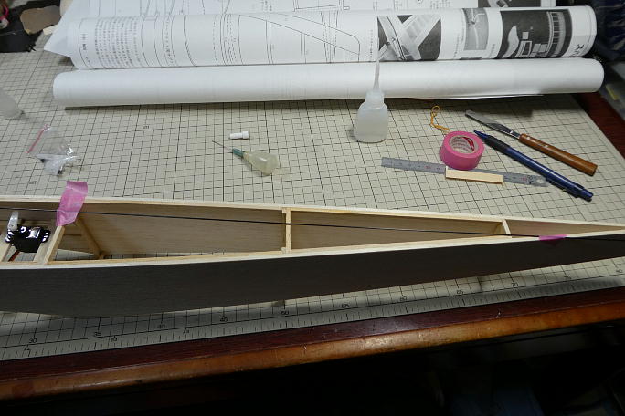 ![]() リンケージは1ミリカーボンロッドです。 アウターにはポリイミドチューブを使用します。サーボを仮止めして、リンケージ のラインを確認します。 ラダー、エレベーターリンケージの取り出し口の加工もしておきます。 ![]() ポリイミドチューブの表面を硬化促進剤で拭いて、接着を確実にします。 ![]() 胴枠にスクラップバルサのサポートを渡し、ポリイミドチューブを接着していきます。 この時、ポリイミドチューブにはカーボン ロッドを通しておき、リンケージラインの直線を出しています。 ![]() 胴体のプランク材を準備します。 マスキングテープで繋げて、極少量のタイトボンドで接着、デスクマットの下に入れて 一晩放置します。 ![]() 瞬間接着剤でプランク材を接着します。 ![]() 後のサンディングに備えて、不要部分のみカットしました。 |