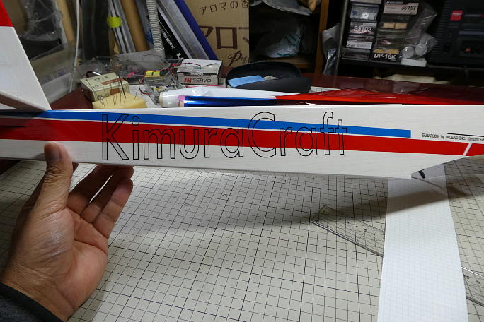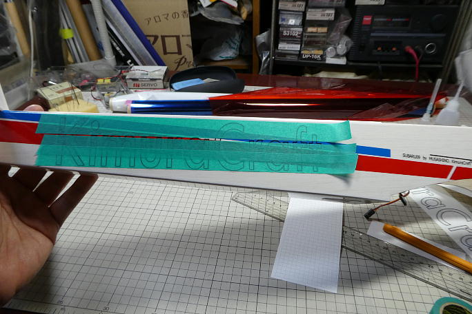 ![]() 導入したカッティングマシーンで、PCで作ったステッカーを切り出します。 透明のステッカーシートにプリンターで印刷しますが、厚くなるので保護シートは貼りません。 その代わり、ステッカー 表面にクリアラッカーを吹いて対候性能を確保しています。 ![]() マスキングテープに切り取ったステッカーを写し取って、胴体に貼ります。 一号機ではテプラを使って印刷し、一語ずつカッターで切り出していました。 ちなみに、「SUBARU09」でした。 ![]() 綺麗に貼れました。 |