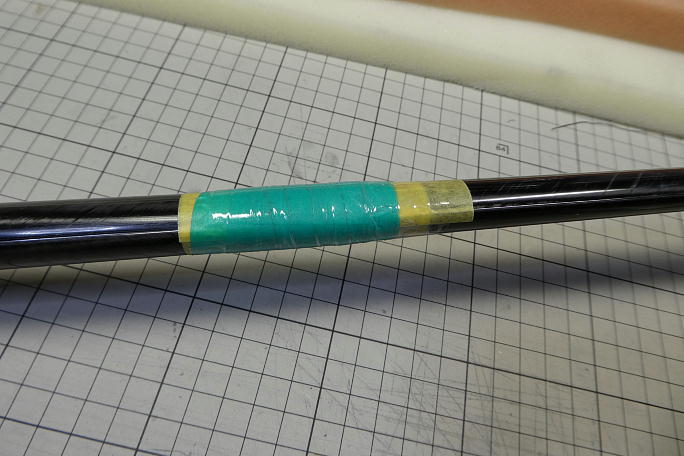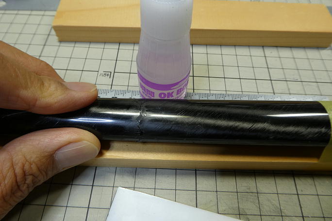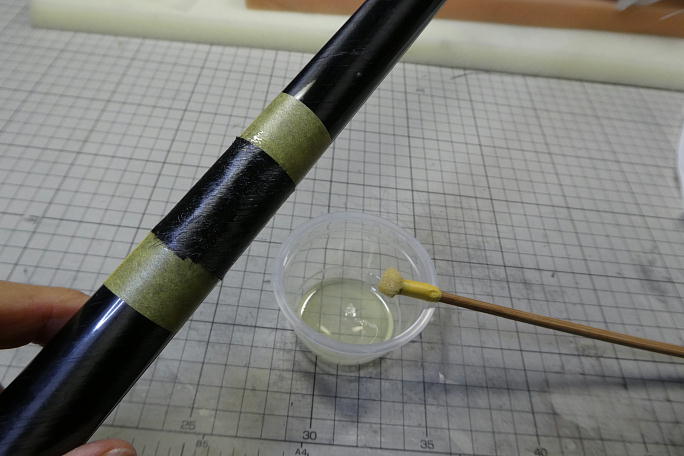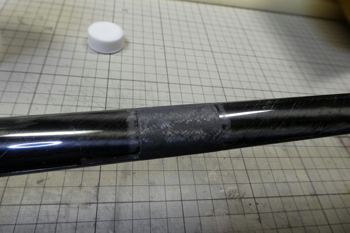 ![]() 外れたポリイミドチューブの接着から始めました。 外径1.5oのノイズレスチューブを瞬間接着剤のノズルに装着、 エレベーターリンケージの穴からチューブを差し込み、 ファイバースコープて確認しながら剥がれたチューブの周囲に 低粘度瞬間接着剤を滴下します。 カーボンロッドとチューブの隙間にでも掛かると、その時点で終了です。 ロッドリンケージは諦めてワイヤー+トーションバー の方式にした方が手っ取り早い位の工作に発展します。 ![]() 添え木を当てて、上下左右に曲がりの無い状態にします。 盛り上がった破断面を針などを使って丁寧に均して、極力平ら になるようにしてから低粘度瞬間接着剤を流します。 破断面の繊維が絡んでくれると、瞬間接着剤だけでも強度が出ます。 ![]() 他の部分が削れてしまわないようにマスキングをして、接着部がたいらになるようにサンディングします。 パーテーション の盛り上がりはカーボンを巻く時に障害になるので削り落としておきます。 ![]() 補強には平米20グラムのバイアスカーボンを使用します。 重ね代を3ミリ取った貼るサイズの型紙を作っておきます。 ![]() ロータリーカッターでカーボンを切り出します。 1枚分位は削るので、3プライ分切り出します。 ![]() 5052でカーボンを貼り込みます。 後の加圧ではみ出ると面倒なことになるので、樹脂の量はカーボンクロスが貼り付く ギリギリ量で行います。 ![]() クリアホルダーを切って作ったマイラーを離型処理をしてカーボンの上に巻き、マスキングテープとクリアテープで グルグル巻きにして加圧します。 ![]() 気温がそれほど低くなくても、使い捨てカイロを巻いて加熱して硬化を確実にしましょう。 ![]() 24時間後に養生を剥がした状態です。 しっかりと硬化しています。 この段階では、マイラーの重ね部分の盛り上がりや、ブームと補強部分に段差が出来ています。 ![]() 他の部分を削らないようにマスキングテープで養生をして、段差を削り取る事を念頭にサンディングしていきます。 ![]() サンディングが終わった状態です。 400番から最後は1500番の耐水ペーパーまで使って仕上げます。 |