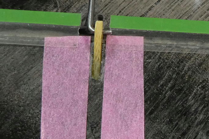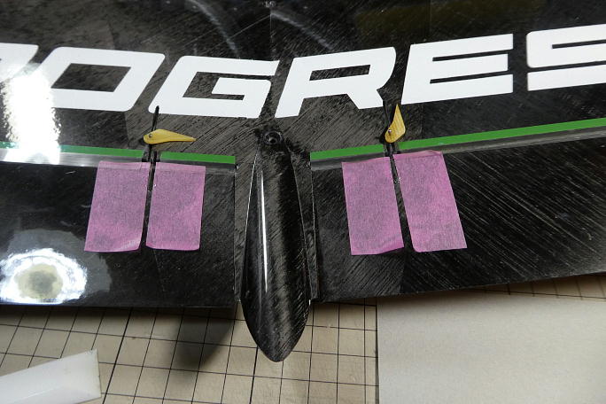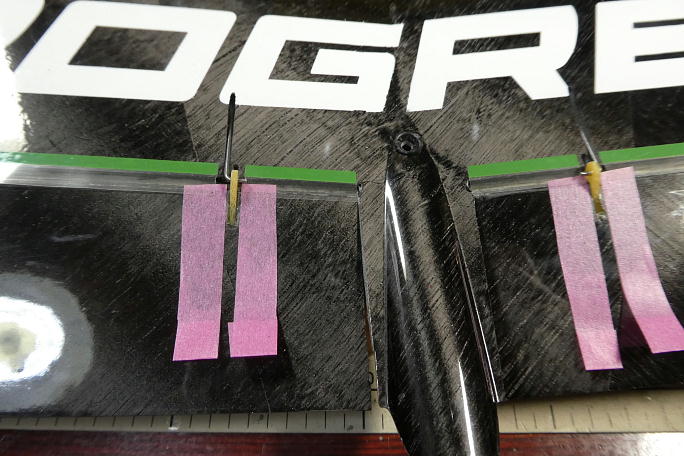 エルロンサーボの取り付け部分をサンドペーパーで平らに均しておきます。 サーボベッドとサーボホールに浮いた ところがあると、接着面積不足で強度が下がります。 ![]() エルロンホーンの取り付け部分から約2ミリ離してマスキングテープで養生をし、サンドペーパーで周囲を荒らして おきます。 後でこの部分にフィレットを形成するので、その準備です。 また、エルロンホーンを取り付ける溝の中のコアは綺麗に掻き出しておき、エアダスターで一吹きしておきます。 ![]() エルロンホーンは底部を5分エポキシ、上部を瞬間接着剤で接着する事にします。 瞬間接着剤だけでは底部、エルロンの下面スキンまで到達させるには、かなりの量を流し込まなくてはならないのと、 5分エポキシだけでは、硬化までに位置がずれてしまう恐れがあるからです。 ホーンを接着してしまうと、そのままではもうエルロンホーンからリンケージロッドを外す事は出来ませんので、ホーンと ロッドし組み合わせておきます。 周囲に5分エポキシを付けたくないので、エルロンホーン取り付け溝ギリギリにマスキングテープを貼って養生をします。 概ねエルロンホーン取り付け溝の底部全体に5分エポキシが入ったら、エルロンホーンを沈めます。 ![]() エルロンホーンの下の角とエルロン構造体の前端の位置にホーンが取り付けられたのを確認したら、ホーンとエルロンの 隙間に、極少量の低粘度瞬間接着剤を流して固定します。 ![]() ![]() ホーン側面にはほとんど隙間はありませんが、後端には三角の隙間が出来てしまいます。 この部分をカーボン パウダー入り5分エポキシで埋めると同時に補強とします。 マスキングテープをホーンから1ミリ離して貼って養生をし、カーボンパウダー入り5分エポキシを塗布します。 ![]() 塗布が終わったら、直ぐにマスキングテープを剥がします。 硬化が始まるまでマスキングテープを貼っておくと、 段差が出来てしまいます。 |